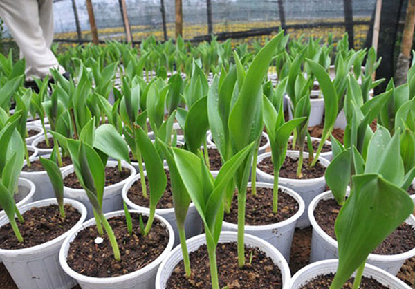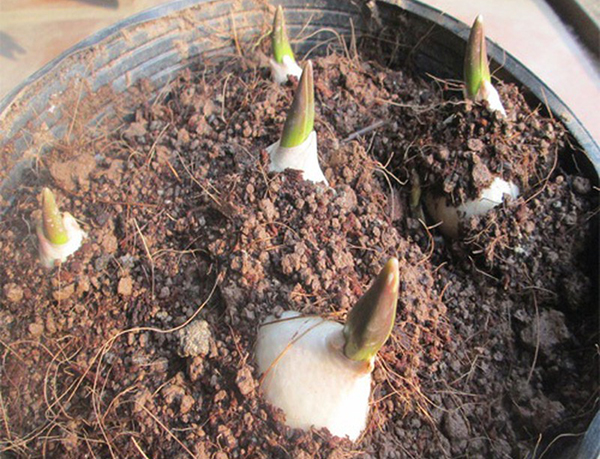 - Cho giá thể vào 2/3 chậu, đặt củ, (số lượng củ/chậu phụ thuộc vào kích thước chậu, mục đích sử dụng), lấp đầy giá thể, tưới đẫm nước lần đầu.