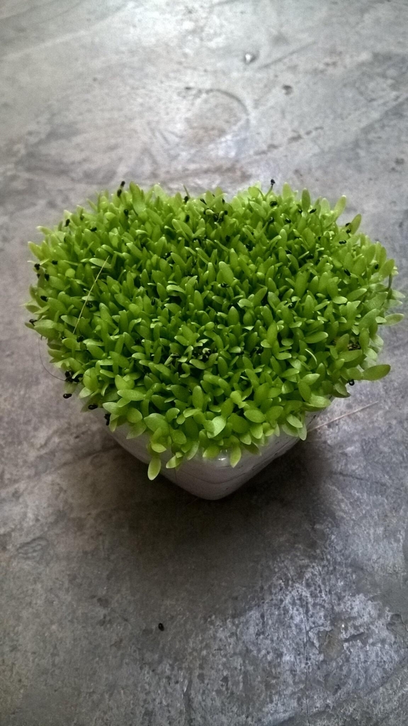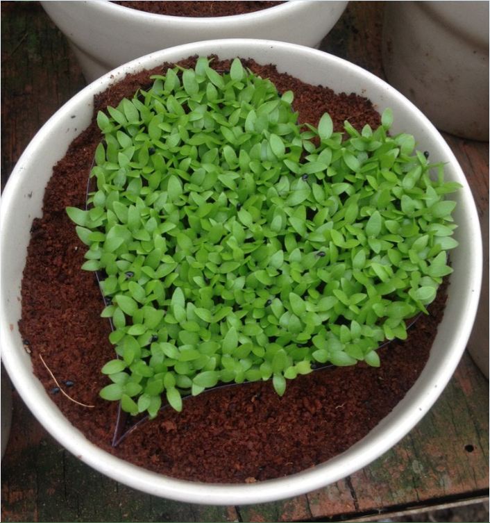 - Lấy muỗng múc nước có hạt giống đã ngâm 24h. Rải hạt giống đều lên mặt xơ dừa, các hạt giống không được chồng lên nhau, hạt cách hạt từ 1mm đến 2mm, để hạt lên mầm đều và đẹp thì phải gieo đều tay và đảm bảo mật độ trồng 0.5gr-0.8gr/1m2