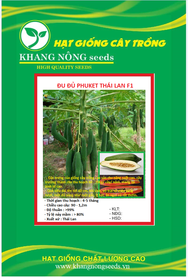 - Đặc trưng của giống đu đủ cao sản cho năng suất cao, cây trưởng thành cho thu hoạch 60 - 70kg/ cây/ năm, mang lại kinh tế cao. Hạt giống đu đủ ruột đỏ quả dài Phuket Thái Lan cho quả có màu xanh đậm, hình dạng dài với chiều dài của quả trung bình là 47 cm, một số quả có thể dài tới 60cm, đường kính trung bình là 9 cm.