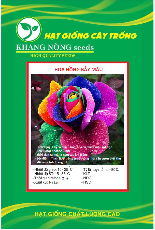 Hạt Giống Hoa hồng bảy màu còn được biết đến với tên gọi hoa hồng hạnh phúc hoặc hoa hồng bảy sắc cầu vồng. Như tên gọi của nó, mỗi bông hoa là một sự pha trộn màu sắc độc đáo. Đây là sản phẩm tuyệt vời do chuyên gia nghiên cứu hoa người Hà Lan- Peter van de Werken sáng chế ra.