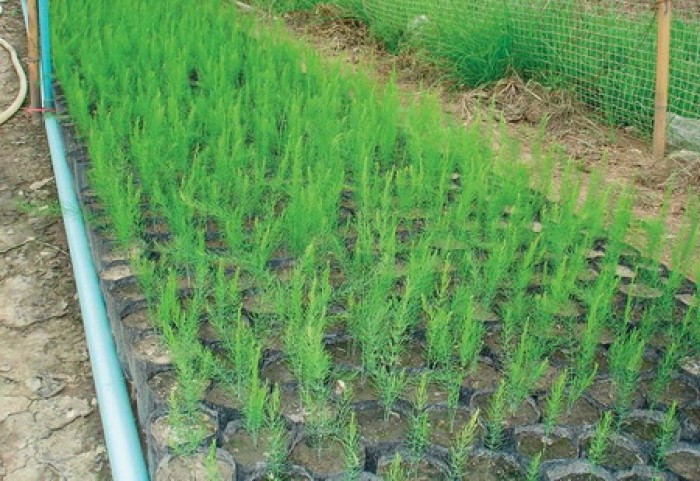 - Sau khoảng 2 – 3 tháng, khi cây măng tây tím cao 50 -70 cm thì chọn những cây khỏe mạnh, sạch bệnh đem ra đất trồng rồi cắt hạ bớt ngọn, giữ cây cao khoảng 30 cm.