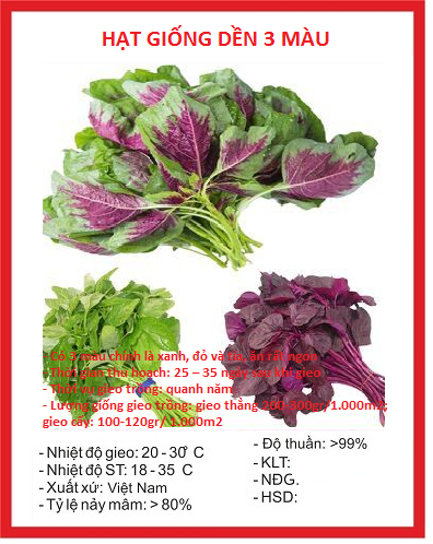 Hạt giống dền 3 màu có khả năng sinh trưởng mạnh, kháng bệnh tốt, trồng được quanh năm. Có 03 màu chính: Xanh, Đỏ, Tía. Ăn ngon ngọt, không xơ. Hạt nảy mầm cao, tỉ lệ nảy mầm tốt và đồng đều.